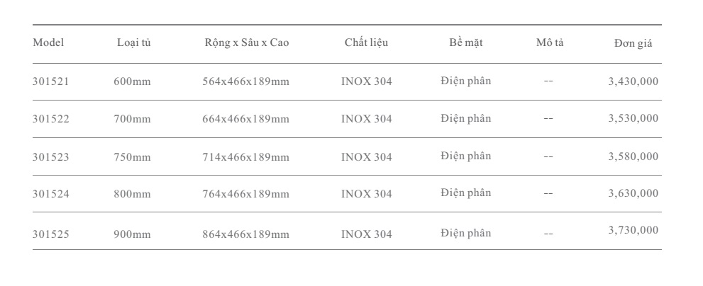 - Loại tủ 600mm -700mm - 750mm - 800mm - 900mm