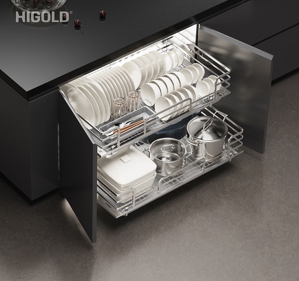 - Sản phẩm có thể tương thích với nhiều loại tủ bếp khác nhau, tải trọng 30kg đựng được nhiều bát đĩa, đáp ứng nhu cầu của gia đình đông người.