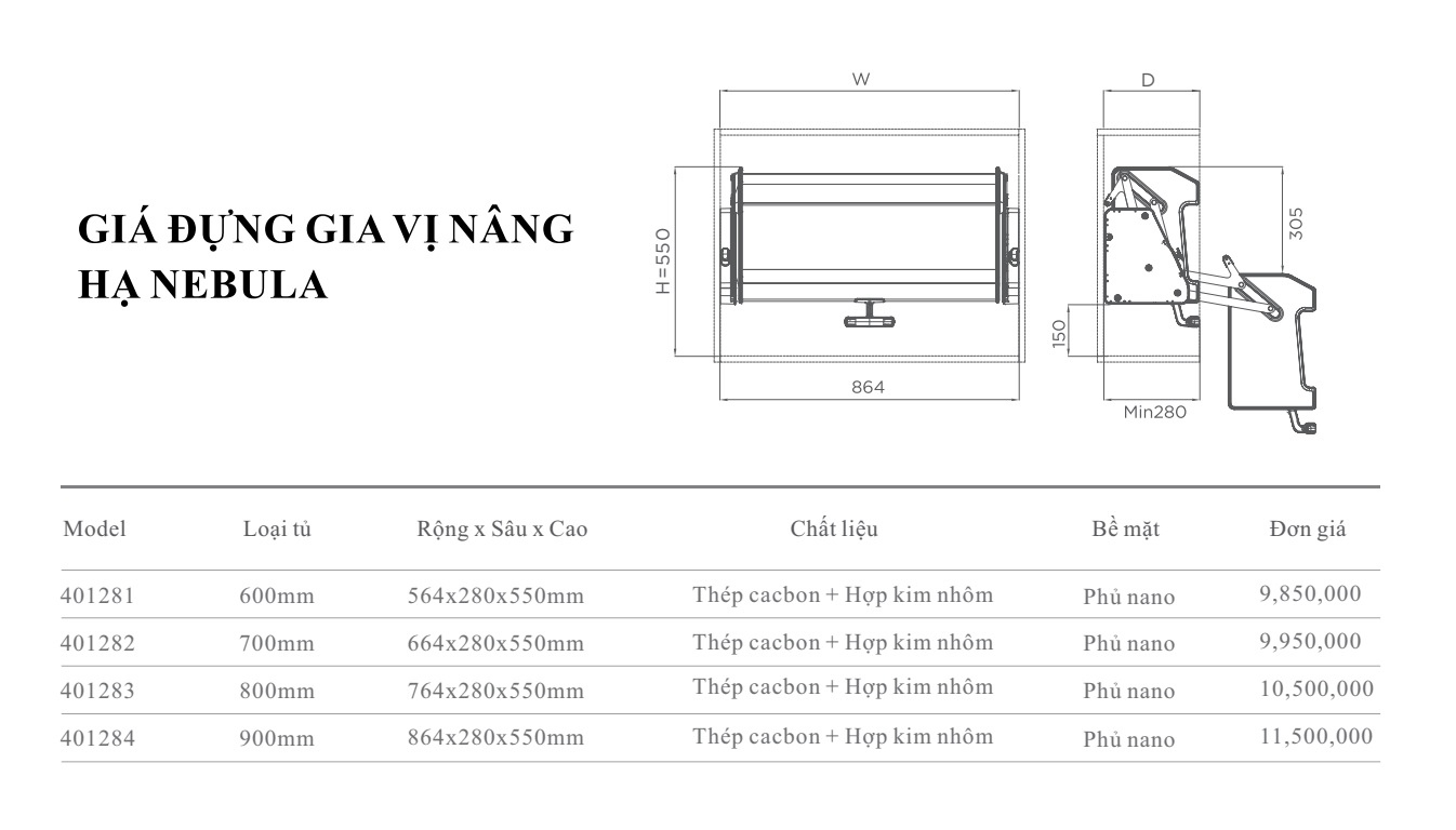 - Giá đựng gia vị nâng hạ Nebula được lắp trong khoang tủ, giúp tiết kiệm không gian, phù hợp với diện tích các căn bếp nhà phố, chung cư,...