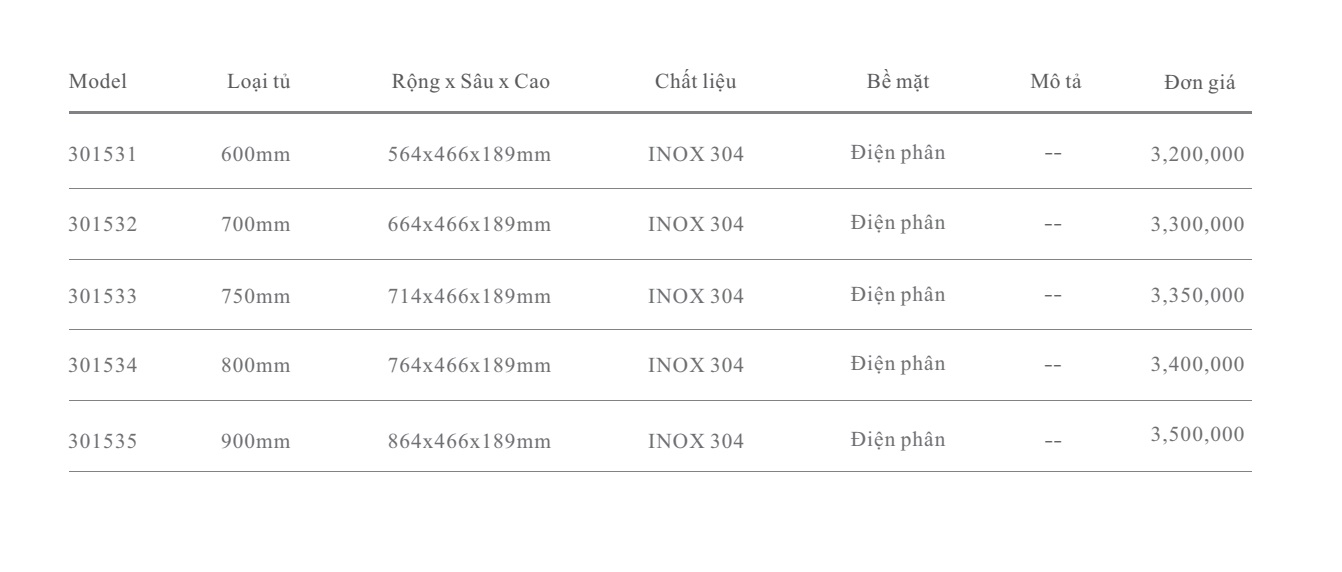 - Loại tủ 600mm -700mm - 750mm - 800mm - 900mm