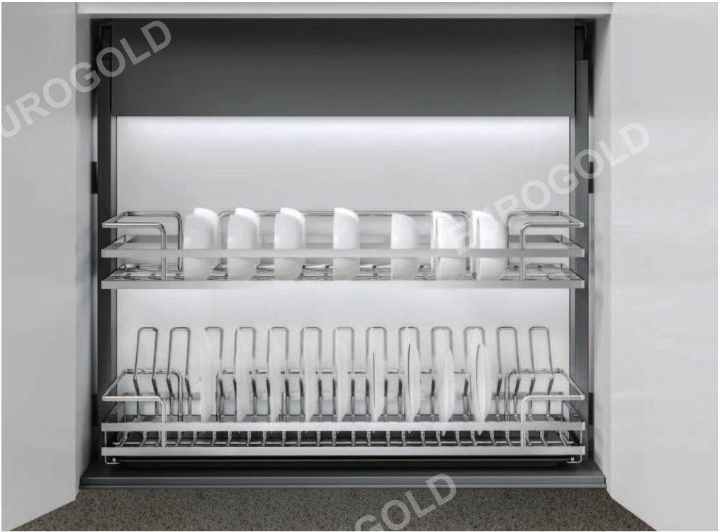 - Khi chạm, hệ thống điều khiển nhận được tín hiệu sẽ điều khiển ray trượt và bộ ròng rọc kéo toàn bộ giá gia vị xuống theo chiều thẳng đứng.