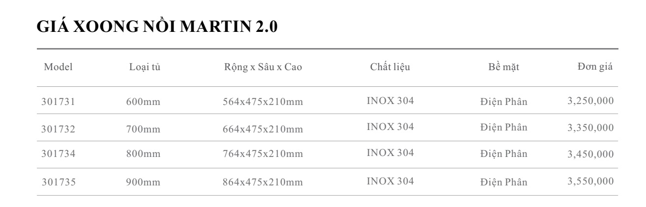- Được chế tác từ chất liệu inox 304 cao cấp, bề mặt điện phân chống han gỉ, đảm bảo sáng bóng lâu dài theo thời gian, giá đựng xoong nồi Martin 2.0 là giải pháp lưu trữ hiện đại, tiết kiệm đến 40% diện tích.
