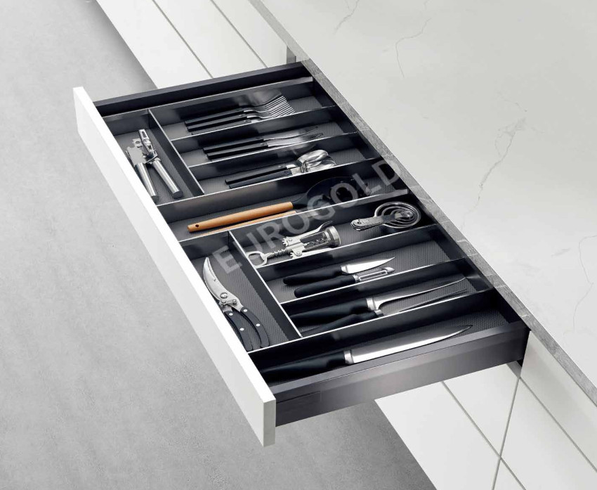 - Thiết kế sang trọng, hiện đại: Khay chia thìa nĩa dao chất liệu nhôm phay xước cao cấp ETA là phụ kiện tủ bếp cao cấp đến từ thương hiệu Eurogold, với thiết kế mang đậm phong cách châu Âu, sử dụng gam màu xám sang trọng, mang vẻ đẹp hiện đại, tinh tế và góp phần nâng tầm không gian bếp. Bên cạnh đó, khay chia thìa nĩa dao còn có kích thước nhỏ gọn, lắp đặt âm tủ bếp dưới tiện lợi, phù hợp với nhiều không gian bếp khác nhau, tiết kiệm tối đa diện tích cho căn bếp.
