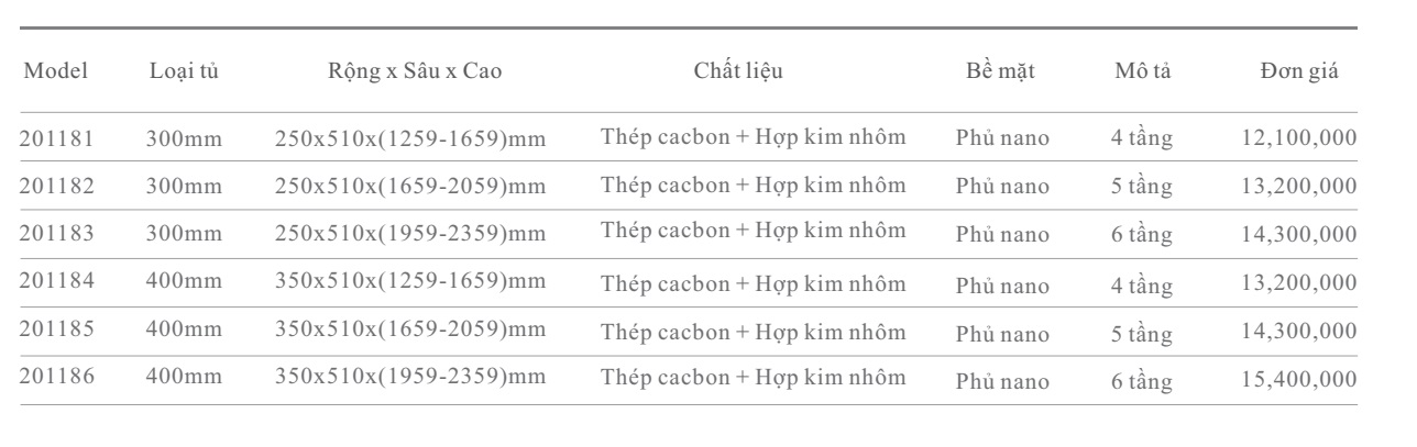 - Loại tủ 300mm